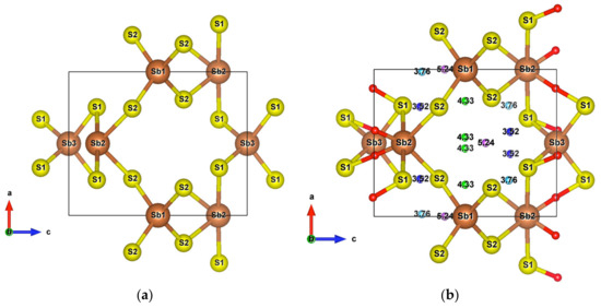 Having plotted all the bonds in the cell (Figure 1b), an interstitial site between the ribbons surrounded by a six-membered ring -Sb1-S2-Sb1-S1-Sb2-S3- clearly appears. The packing ratio of the cell is about 29% relative to atomic radii, indicating enough space for introducing impurities. Moreover, the existence of the metastibnite mineral in the Sb-S system, which has the approximate composition of Sb2S3 and contains metals in small amounts [27,28,29], allows one to envisage the adding of impurities into the Sb2S3 crystal. The [Sb4S6]n chains, which are parallel to the y-axis, result in a higher electrical conductivity in this direction (Figure S1). The insertion of metal atoms, in the interstitial sites described above, generates a new chain of atoms along the z-axis that creates infinite [Sb4S6M2]n chains along this axis by connecting adjacent [Sb4S6] ribbons (Figure 5a,b). In order to keep the original [Sb4S6]n chains and the semiconducting properties of the material, the light and small Be atom is chosen to be inserted into the cell interstitial sites.