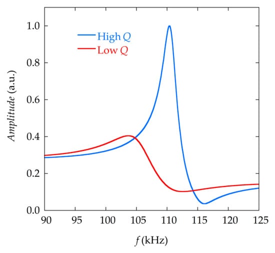 The quality factor can be estimated from the resonance curve as the experimentally measured resonance frequency f m a x (at which the amplitude is maximum, A m a x ), divided by the width of the signal Δ f (measured as the full width at half maximum, corresponding to amplitudes A m a x / 2 ) [13]: