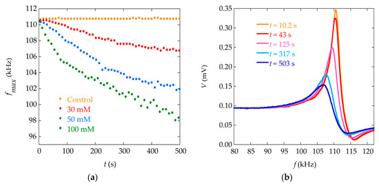 Figure 2. (a) Temporal evolution of the magnetoelastic resonance frequency of the sensor during the reaction of precipitation for different concentrations (30 mM, 50 mM and 100 mM) and a control curve (sensor in a vial with distilled water). The value of the resonance frequency, f m a x , is obtained as the frequency at the maximum amplitude of measured resonance curves (Figure 2b); (b) Measured magnetoelastic resonance curve signals of the sensor at different times during the precipitation process for the concentration 30 mM. Data taken from Ref. [20].
