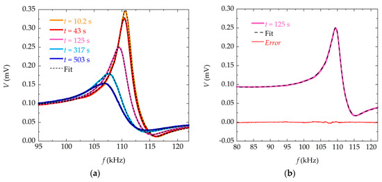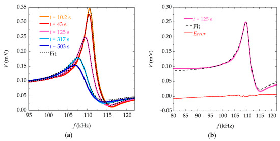 Figure 4. Fit to Equation (9). (a) Measured magnetoelastic resonance curves of the sensor at different times during the precipitation process for reactants of concentration 30 mM, and corresponding numerical fittings (in dashed lines) to Equation (9); (b) Measured magnetoelastic resonance curve, fitting to Equation (9) (in dashed line), and corresponding error (in red) of the sensor at time t = 125 s for reactants of concentration 30 mM.