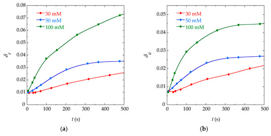 Figure 5. Evolution of the damping parameters obtained through the numerical fitting to Equation (9) of the resonance curves during the precipitation time for different concentration of reagents (30, 50, and 100 mM). (a) Damping parameter δ r ; (b) Damping parameter δ a .