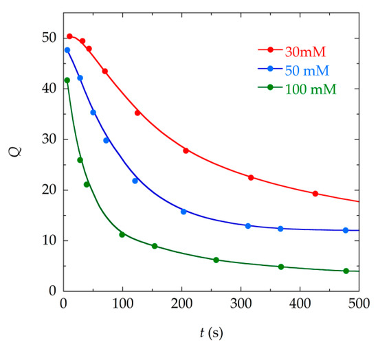 Figure 6. Evolution of the quality factor Q of the resonator during the precipitation process for different reagents concentrations (30, 50, and 100 mM) obtained through the numerical fittings to Equation (6) of the resonance curves.
