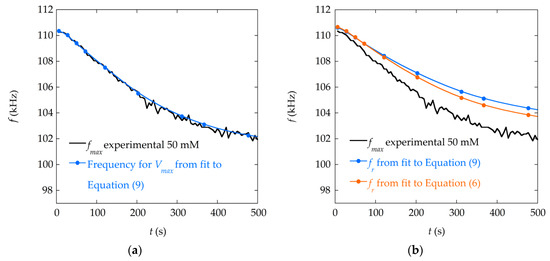 Figure 7. (a) Evolution of the frequency corresponding to the maximum of the resonance curves resulting from the fitting to Equation (9) of the resonance curves measured during the precipitation, when the concentration of the reactants is 50 mM, compared to experimental data ( f m a x ); (b) Evolution of the f r obtained in the numerical fitting to Equations (6) and (9) of the measured resonance curves, compared to experimental data ( f m a x ).