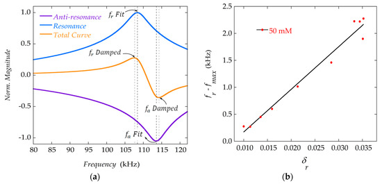 Figure 8. (a) Frequency response of the system for resonance and anti-resonance behavior, and the total response affected by the damping. Corresponding resonance and anti-resonance frequencies are indicated; (b) Evolution of the difference between the experimental resonance frequency f m a x and the resonance frequency obtained through the fitting to Equation (9) as the damping parameter δ r increases, for the case of concentration 50 mM. The shift in the resonance frequency becomes greater as the damping increases.