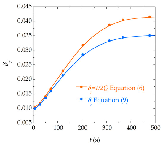 Figure 10 represents the difference between the fitted parameter δ r obtained with both numerical fittings, when it is related by means of the above equivalence expressions, for the data corresponding to a precipitation experiment. As can be seen, the difference between the damping parameter increases as the precipitation reaction advances. This is due to the fact that, as the mass of calcium oxalate is deposited in the resonator, the damping increases and the amplitude of the signal becomes smaller. This decrease of the signal causes that the background signal of the measurement gains in importance with respect to the resonance signal. It should be noted that Equation (9) explicitly takes this background into account, unlike Equation (6). For this reason, as the reaction progresses, the effect of the background signal is more noticeable in the fitted parameters. In order to elucidate the role that this background has in the values of the parameters obtained and to be able to compare both expressions under equal conditions (when neither of the two expressions takes this background into account), a fitting to a similar expression to Equation (9) where the background contribution is removed was carried out. The comparison of the damping parameters δ r obtained with this expression and with Equation (6) is shown in Figure 11. It can be seen that, indeed, in this case both models provide parameters of almost equal value.