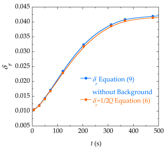 Figure 11. Comparison of the damping parameter δ r obtained by the fitting to Equation (9) without taking into account the background parameters ( a and b ), and the damping parameter δ r obtained through the fitting to Equation (6).