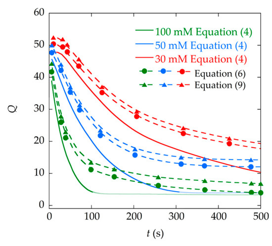 Concentration (mM)Time (s)Q (Equation (4))Q (Equation (6))Q (Equation (9))Relative Error * (%)