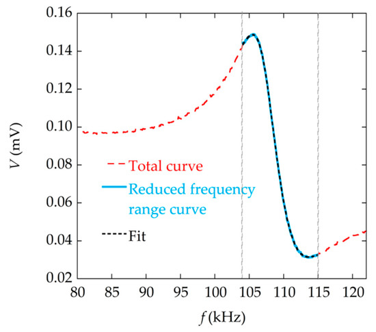 In addition, on behalf of a quick measurement, the frequency range in which the resonance curve is measured can be reduced. The fitting procedure can still provide, under these conditions, a valid value of the damping parameter, which the method of the half maximum bandwidth cannot give. As a proof of this, Figure 13 shows the fitting of the resonance curve in a reduced frequency range. The Q value obtained in this way, Q = 17.4, is practically the same as the one obtained with the fitting of the complete curve, in a wider frequency range, Q = 17.5.