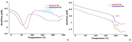 (a) differential scanning calorimetry (DSC) thermograms in the first heating scan of unused CA and recovered CA (b) DSC thermograms in the second heating scan of unused CA and recovered CA.