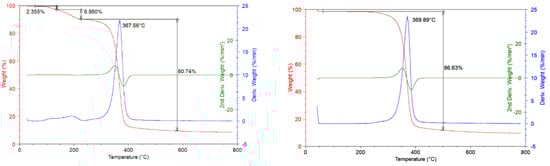 where β = heating rate in K min−1, c is a constant, T = temperature in K, Ea = activation energy in kJ/mol, and R = universal gas constant. The plot log β versus 1/T, obtained from TGA curves recorded at several heating rates, should be a straight line. The activation energy can be evaluated from its slope. The approximation on which both methods are based is that each degradation step can be considered as a reactive process of the first order and the first derivative function results constant [20,25,26,27,28]. The Kissinger and Flynn–Wall–Ozawa methods for calculating the activation energy have the advantage that they do not require knowledge of the reaction mechanism.