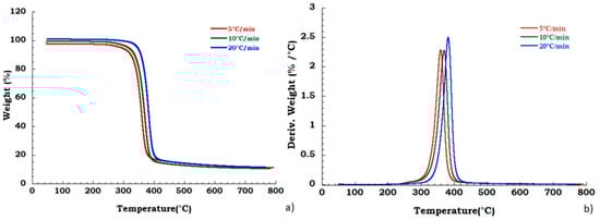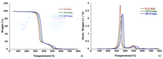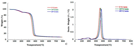 Moreover, to confirm our data in Figure 4 we reported, the thermogravimetric curves of unused CA at different heating rates and corresponding DTG curves under the nitrogen flow. Mass is lost with increasing temperature rate yielding earlier degradation onsets. It can be noticed that the degradation step related to the plasticizer decomposition is independent from the heating scan rate. DTG curves display that maximum peak temperatures are moderately dependent upon heating rates; while Figure 5 shows, respectively, the TG (a) and DTG (b) curves related to the recovered sample at different heating rates under the nitrogen inert flow. It was observed that the absence of degradation step of plasticizers is independent from the heating rate and the deacetylation step is somewhat dependent from the scan rate. Moreover, the residue of all the experiments carried out on unused and recovered CA is independent from the applied scan rate value.