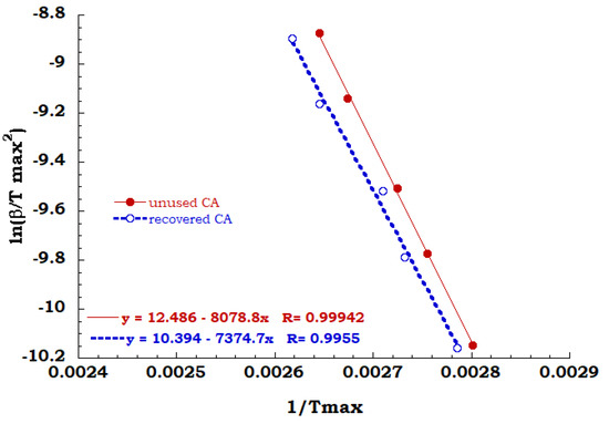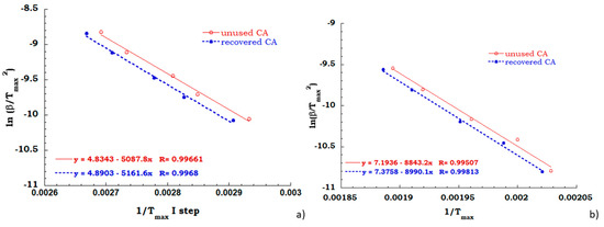 Kissinger method has been employed for all TGA scans performed on unused CA and recovered CA, in order to evaluate the activation energy of each degradation step in air and nitrogen flow. A comparison between Kissinger ln(β/Tmax2) versus 1/Tmax curves for the degradation stage identified for both the analyzed samples in the inert and oxidant ambient allowed to collect data discussed below. Regarding to the inert environment (see Figure 8), the deacetylation process of the unused CA sample appears to occur with a greater energy value than the recovered sample (67 KJ/mol for unused CA and 61 KJ/mol for recovered CA). It is worth noting that the dehydration and the plasticizer decomposition take place for the unused sample and the energy contribution of endothermic process of dehydration could be recovered with greater effort to complete the deacetylation process.