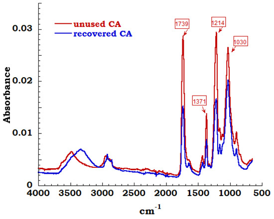 The spectra of unused sample compared to the measurement carried out on recovered sample is reported in Figure 11. In the region between 3700 cm−1 and 3000 cm−1 and precisely at 3400 cm−1, it is possible to observe the extended band assigned to OH stretching derived from adsorbed OH stretching derived from adsorbed water. Symmetric and asymmetric stretching of C-H methyl group are identified corresponding to 2920 cm−1 and 2850 cm−1 bands; these bands are connected to sharp peak at 1432cm−1 due to –CH2 bending. The characteristic bands of cellulose acetate have been highlighted and typical carbonyl stretching band of acetate group is very intense and can be easily identified. These carbonyl band of acetyl groups is visible and appears in an isolated region of FTIR spectrum at 1739 cm−1. Bending of the CH group (belonging to methyl or hydroxyl groups in the plane) at 1371 cm−1 and a 1214 cm−1 band linked to the stretching of the CO bond of the acetyl groups are identified. Finally, the asymmetric stretching of the ester group C–O–C at 1100 cm−1 and the vibrational modes of the C-O bond in cellulose molecules, that generate a band centered at 1030 cm−1, are noticed [33,34].