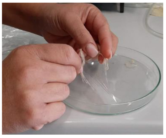 Before extruding our dried recovered CA, we have realized a cast transparent film; in fact, the CA recovered has been dissolved in acetone (5% w/w) and cast in a petri dish. We obtained a very transparent film (see Figure 12).