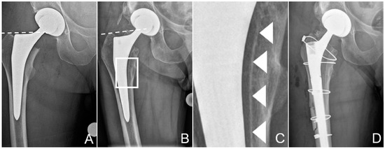 Zone of interest of the anteroposterior radiographies of the pelvis after total hip replacement (A) and after the patient had suffered the periprosthetic fracture of the proximal femur (B). Dashed lines at the tip of the greater trochanter help identify posttraumatic sintering of the stem. Note that the stem was undersized, with more than 1 mm between the stem and the inner cortex. Scale-up of (B), marked by a white rectangle, is provided in (C) to better illustrate the dense line, most likely the hydroxyapatite (HA) coating, separated from the stem, marked by white arrowheads. These tissues could be sampled for further analysis. (D) shows the condition after revision. The osteotomy, which was necessary to retrieve the stem, is visible, as are the cerclage cables used for fixation of the fracture and the osteotomy. Additionally, note the thinner liner in the cup, to accommodate the larger head.