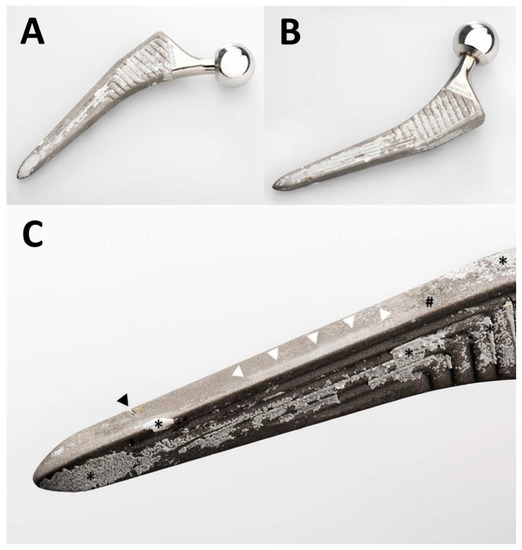 Photographs of the retrieved Quadra-H stem. An overview of the anterior aspect is shown in (A) and of the posterior aspect in (B). A greater magnification of the anterolateral aspect of the distal part of the stem is shown in (C). The femur had already fractured, and the stem could be retrieved without any instrumentation. The transverse nick near the tip (black arrowhead in (C)) was caused by the transverse osteotomy of the transfemoral approach. This was the only damage caused by instruments. Note unevenly distributed patches of ongrown bone on the stem’s surface (* in (C)). Only small patches of residues of the HA coating (# in (C)) are visible. The near edge of the stem presents an extensive area of polishing (white arrowheads in (C)) of the grit-blasted surface of the metal alloy.
