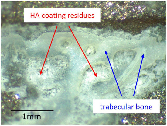 In areas where bone had ongrown on the HA coating, newly formed and vital bone in good contact with the HA layer was identified in the histology sections (Figure 4). No areas of local necrosis or inflammatory reaction were detectable. This is consistent with previous studies indicating the osteoconductive effect of HA [8,9,10,11,13,15]. The bonding between HA and bone was solid, and a separation between the two components was not noticed. No direct ongrowth of bone trabeculae in areas with dissolved HA coating was observed. Fragmentation of HA coating was also visible on the surface of the retrieved implant (Figure 3). This has also been described in animal studies with longer periods of observation [14,27]. Mechanical properties of the HA coating are weakened by this fragmentation, favoring delamination [14,27]. Every interface is a mechanical weakness, particularly if the mechanical properties of the materials differ, as is the case with HA and titanium alloy. Thus, it is most likely that such an interface is prone to material failure. This is supported by an animal push-out model of ingrown implants in which delamination is the common failure mode of HA coatings [16]. However, delamination of the HA coating was discarded in a postmortem study, as it was thought it was caused during stem retrieval [10]. While being a well-known failure mode of any interfaces, to the best of our knowledge, delamination of HA coatings is not otherwise reported in arthroplasty. PMMA-embedded histology is a technically demanding technique, but allows interfaces between bone and implants to be preserved. Paraffin-embedded histology, the clinical standard procedure, suffers from cutting artefacts, and decalcification would simply dissolve HA or calcium phosphate coatings.