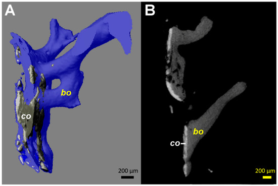 Computed tomography (µCT) images from the tissue samples collected at the interface between the stem and the medial cortical bone (area marked by arrowheads in Figure 1C). Identical patterns could be identified on all fragments available, even if the images from only one are illustrated. (A) 3D reconstruction in semi-transparent mode shows the close contact of the coating material (co, colored in grey) with bone (colored in blue). The coating ca has a higher density (brighter appearance) than bone (bo). (B) 2D transverse reconstruction with section thickness of 10 µm, showing bone ongrowth on the coating material, without an ingrowth or growth of bone structures through the layer of the coating. All coating fragments were oriented in one plane and were 60–100 µm thick. Additionally, some small and globular fragments of the HA coating (size <20 µm) are identifiable.
