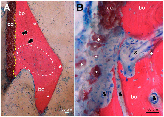 Histological picture (stained Giemsa–Eosin) of tissue sampled at the site corresponding to the dense line (arrowheads) in Figure 1C, maintaining the same orientation. (A) Overview of the HA coating (co, stained brown) showing firm bonding (dashed yellow line) to ongrown bone (bo, stained red) consisting of mature lamellar bone (*, black arrows marking lamellar orientation) surrounding newly formed woven bone (encircled by a white dashed line). In nearly all osteocyte lacunae, blue stained osteocyte nuclei indicate bone viability. (B) higher magnification of an HA coating defect with dispersed HA fragments (+) surrounded by fibrous scar tissue encompassing proliferated capillaries (&) and extending into resorption lacunae of remodeled woven bone without cellular inflammatory reaction.