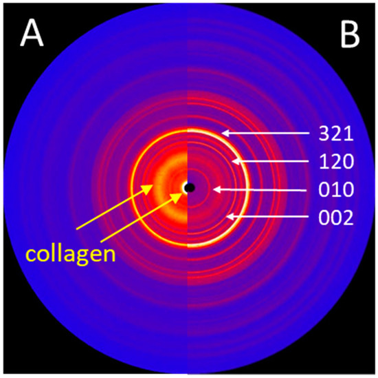 (A) 2D X-ray diffraction image (IPDS-II, Mo-radiation) of the trabecular bone structures, showing structural features of both HA and collagen. (B) 2D X-ray diffraction image of the HA powder obtained from the surface of a new stem, showing sharp diffraction peaks. The main diffraction peaks (hkl) of the HA crystallographic phase are indicated.