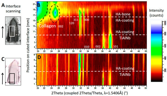 X-ray diffraction studies on the implant surfaces, in (B) the results corresponding to the area marked by a white rectangle from the tip of the retrieved stem in (A), and in (D) the results corresponding to the area marked by a black rectangle from the tip of a new, unused stem in (C). The scan was performed in the area of interest, following the direction marked by the arrow. The corresponding position may be read from the y-axis in (B) and (D). Both diffraction patterns (B) and (D) show the successive change from the TiAlNb of the stems’ metal alloy to the HA phase of the coating. The scan progresses horizontally on a slightly oblique cut. In (B), structures from the ongrown bone can be seen on top of the HA coating. (---white) shows the phase change related to the position on the sample, and dashed black lines show the phase information retrieved from the organic material such as collagen. The main diffraction peaks of the TiAlNb and HA crystallographic phases (hkl) are marked by the corresponding hkl values.