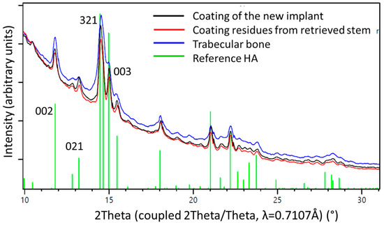 1D diffraction patterns obtained by a 360° integration of the 2D diffraction patterns (Figure 6). The indexing of the HA phase is shown in green. The peaks of the coating material from a pristine stem (black line) are higher and sharper than those from the materials residue recovered from the retrieved stem (red line) where the HA already was altered by biodegradation. The blue line marks results from bone trabeculae chipped of the retrieved stem. The observed peak broadening on the trabecular bone sample could be related to nano-sized crystallites and/or better nano-ordering due to strain probably formed during the growth process. Note the higher background signal from the bone sample, due to amorphous materials and proteins present within the tissue.