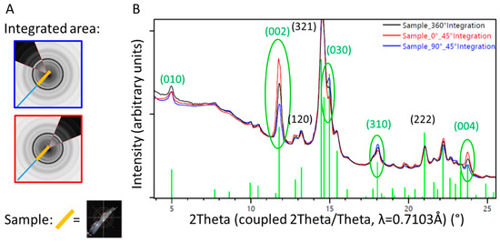 1D diffraction pattern of a sample of trabecular bone from the surface of the retrieved stem. Diffraction patterns from specific sectors (blue and red lines, corresponding to the orientation of the detector illustrated on the left) are compared with results from the 360° integration (black line). The orientation of the HA within the ongrown bone is directional, which can be visualized by different intensity profiles in dependence of the direction of investigation, differing from the random orientation observed in the 360° integration (black line). (A) Illustration of the partial integration of the 2D X-ray diffraction profile, blue perpendicular to the sample orientation, and red parallel to the sample orientation. (B) 1D diffraction profile superposed for the 360° (black) and 45° integration of the sectors illustrated in (A).
