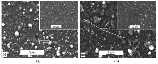 The shape of the macroparticles is mainly spherical. Their size ranges from tenths of a micrometer to a few micrometers. About 50–60% of them are characterized by dimensions up to 1 µm, and some reach dimensions even up to 6 µm. A few irregular particles, mainly of larger dimensions, are also visible. Their presence is likely related to the agglomeration of particles ejected from the cathode before reaching the coating surface [29].