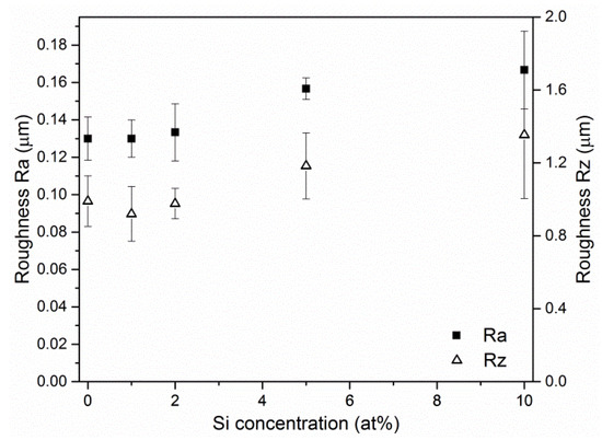 Due to the large number of macroparticles of different dimensions on the surface of the coatings, the roughness measurement is burdened with a relatively high measurement uncertainty (Figure 2). These results may indicate a small but measurable dependence of the AlCrSiN coating surface roughness on the silicon concentration. It should be also mentioned that the Ra and Rz roughness parameters for the CrN reference coating are 0.09 µm and 0.76 µm, respectively. Thus, the addition of aluminum into the CrN coating significantly deteriorates its surface quality, causing a Ra and Rz increase by about 30% and 44%, respectively.
