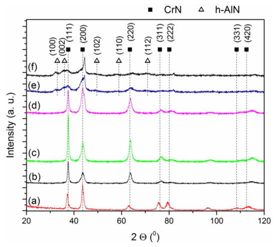In Figure 3a, within the presented range of 2Θ angles, all diffraction lines from the CrN phase are visible, i.e., 111, 200, 220, 311, 222, 400, 331 and 420, with intensities only slightly differing from the standard. The shift of the 111 line due to the presence of aluminum in the CrN network was small, around 0.3°, while, for the 220 line, around 0.7° and, for the 420 line, around 2.0°. The addition of silicon does not result in the diffraction lines shift. This was found by comparison of the XRD pattern for the coating without (Figure 3b) and coating formed from a cathode with a silicon concentration of 2 at% (Figure 3d). The positions of the diffraction lines remain the same.