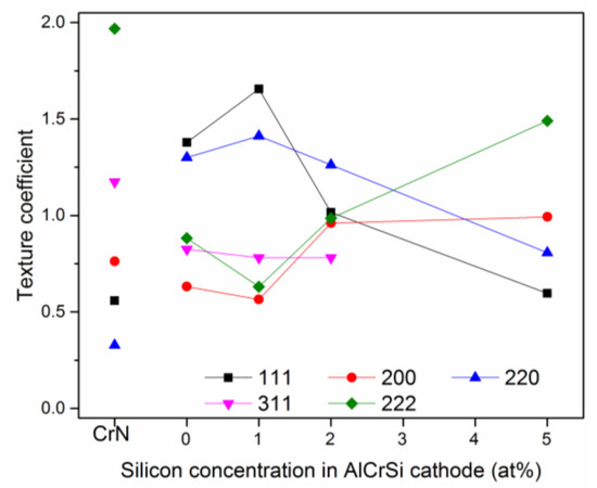 Texture coefficient of the CrN and AlCrSiN coatings formed from Cr cathode and cathodes with silicon concentration ranged from 0 to 5 at%.