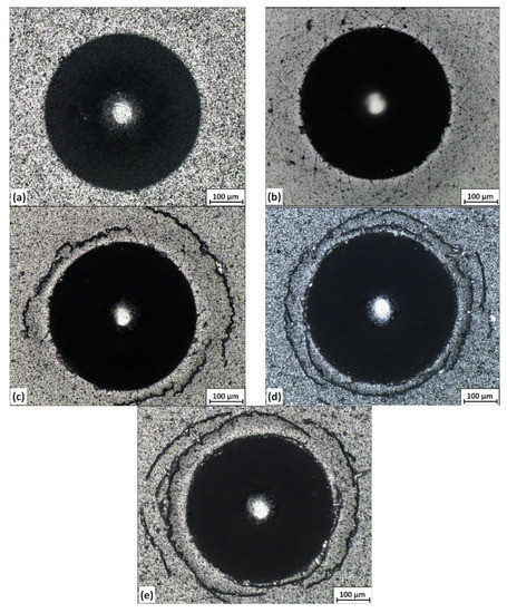 The AlCrN coating shows no significant cracks around the indentation in the Daimler-Benz test (Figure 7a). The coating can be evaluated to adhesive strength HF1, which indicates a strongly adherent coating. There are numerous, short radial and oblique cracks around the indentation in the coating formed from the cathode containing 1 atm.% Si (Figure 7b). Due to the greater number of cracks, the adhesive strength can be classified as HF2. Only slight radial cracks occur in coatings formed from cathodes containing 2, 5 and 10 at% Si (Figure 7c–e). However, circular cracks are visible, and their number increases with the silicon concentration. Due to the small delamination at the edge of the indentation or at circular cracks, the adhesive strength can be classified as HF3. It should be stated that there is no massive delamination around the indentations in the tested coatings, as it would disqualify the coating from industrial applications.