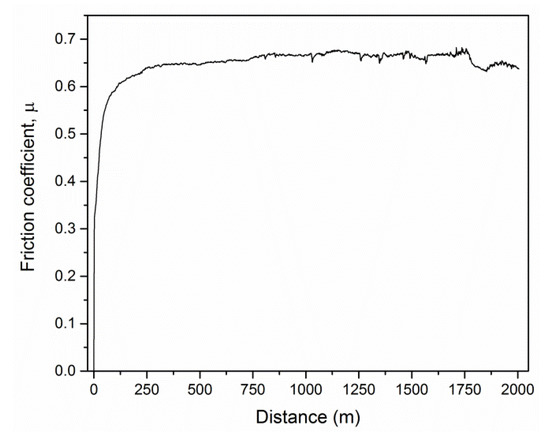 It is known that the type of counterpart, as well as the parameters of the friction test, determine the friction coefficient and wear [8,35]. The possibility of creating bonds between the coating and the counterpart increases the interaction between them, causing an increase in the friction force. For this reason, all coatings were tested in the same ball-on-disc system and conditions. Figure 8 shows the behavior of the friction coefficient versus the distance for a selected coating formed from the Al69Cr30Si1 cathode.