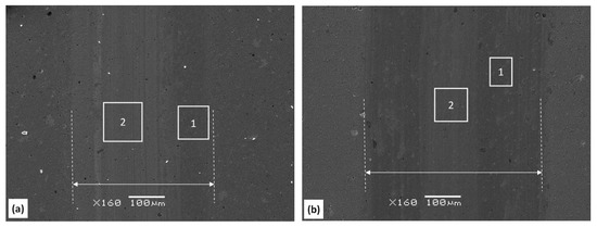 The wear tracks were examined for tribochemical reactions that could occur during the friction test. These were analyzed by EDX at various points of the wear tracks and coatings. Figure 9 shows the areas within the friction tracks, marked with numbers 1 and 2, where the chemical composition analysis was carried out. It was found that there is a much higher oxygen concentration in so-called dark areas (symbol 1) than in gray areas (symbol 2) (Figure 11). Simultaneously, the Al/(Al + Cr) ratio in the wear tracks of the coatings (Table 1) remains similar. At points outside the wear tracks, the oxygen content ranged from 0.7 to 1.6 at%, i.e., it was close to the values presented in Table 1.
