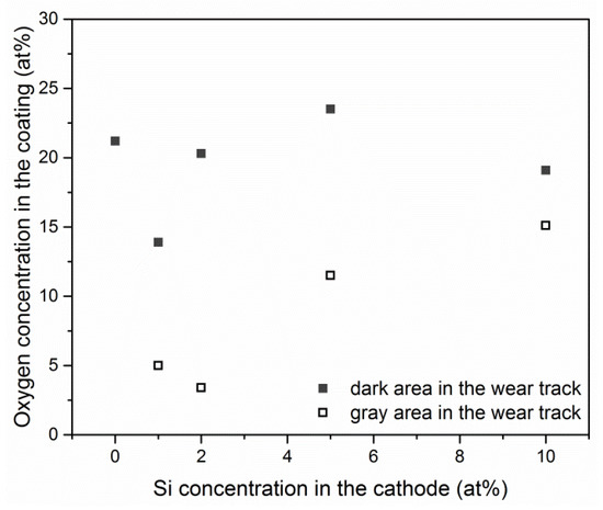 As shown in Figure 11, a higher oxygen concentration is observed in the so-called dark and gray areas in the wear tracks (Figure 9) than outside the friction trace. This is probably related to the adsorption of oxygen in the friction track from the surroundings. The applied parameters of the friction test, i.e., the normal load of 20 N and the sliding speed of 0.2 m/s, favor the occurrence of the so-called flash temperature [8,47]. It can even exceed 1000 °C [8]. This facilitates the formation of Al2O3 and Cr2O3 oxides constituting the tribolayer. There is a greater amount of oxygen, regardless of the silicon concentration in the coating, in the dark areas (marked as 1 in Figure 9) compared to the gray ones (marked as 2 in Figure 9). Lin et al. [48] indicated that this may be related to a higher local temperature during sliding, which promotes the formation of the oxide phase in the friction track. Additionally, numerous tests of the top layer of the coating using the XPS method indicate an increased amount of oxygen in this part of the coating compared to the interior [5,20,35]. The difference in the colors of the coating may be related to the thickness of the oxide layer.