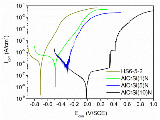 In contrast to AlCrSi(10)N, the remaining AlCrSiN samples exhibit a similar course of the anodic polarization curves to that obtained for the steel substrate. They are characterized by a high increase of the anodic current density in a narrow potential range. Thus, although the AlCrSi(1)N and AlCrSi(5)N coatings show higher corrosion potentials compared to HS6-5-2, beyond the Ecorr values, oxidation of the substrate components occurs at a high rate, as evidenced by the icorr and Rp determined for these specimens.