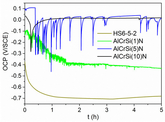 - AlCrSi(10)N—stable OCP over a wide time interval, indicating high chemical inertness of the coating in the corrosion environment used. The optical image of the tested sample area showed no significant damages to the AlCrSi (10)N coating (Figure 14c).