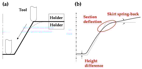 However, shape errors occur during and after forming in incremental forming [5]. During forming, bending deformation occurs in the sheet by the force of the tool pressing the sheet and the force of the blank holder holding the sheet [6]. Furthermore, after forming, skirt spring-back occurs due to the elastic recovery of the sheet. It is impossible to produce the desired shape despite the aforementioned problems. Figure 1b shows a schematic drawing of shape errors, such as the section deflection, spring-back, and height error in the formed shape.