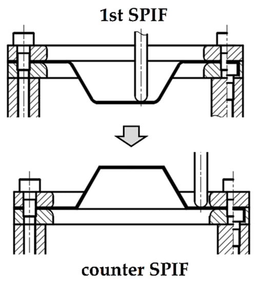 The incremental forming process of (a) first single point incremental forming (1st SPIF) and (b) counter SPIF.