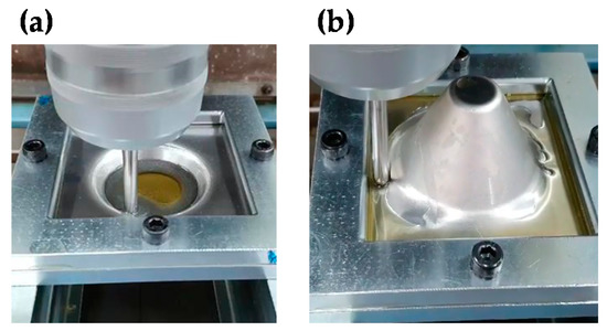 A CNC machine (NAMSUNG NR-35, Seoul, Korea) was used to do the sheet in incremental forming. The CNC machine was controlled in the x, y, and z axes; the bed of the CNC machine moved in z direction and the head moved in x and y directions. Pictures of 1st SPIF and counter SPIF are presented in Figure 3. After finishing the 1st SPIF, the sheet was rotated 180°, as shown in Figure 3b, and the counter SPIF was conducted.