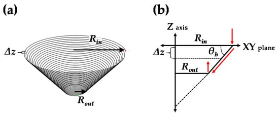 First, the tool path of the conventional incremental forming process must be described. The tool path of a circular cup shape is shown in Figure 5. The tool path was controlled by parameters of the entry radius (Rin), exit radius (Rout), forming angle (θh), and step-down size (Δz).