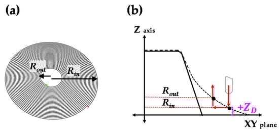 The tool path of counter SPIF was modified according to the shape error. The initial tool path of counter SPIF was disk shaped, as shown in Figure 6. The tool path can decrease the shape error though additional forming of the section deflection region of the circular cup shape. It gives bending deformation in the opposite direction. The tool path is controlled by parameters of the entry radius (Rin), exit radius (Rout), entry depth of tool (ZD), and step-down size (Δz). The entry depth of the tool (ZD) is the main process parameter for controlling the bending deformation in the opposite direction. The ZD is defined with reference to the XY plane. The XY plane denotes the bottom when the sheet is rotated 180° after forming a circular cup shape.