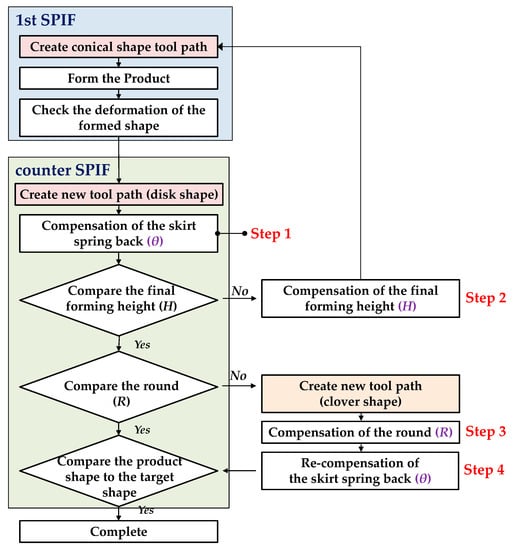 Figure 7 shows a flow chart to generate the tool path for the two-stage forming process. In the 1st SPIF, the tool path of the first trial was the same as the tool path in the conventional SPIF [23]. In the counter SPIF, a four-step compensation method was used to decrease the shape error.