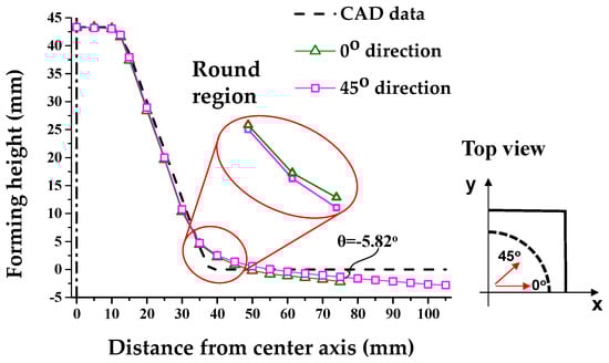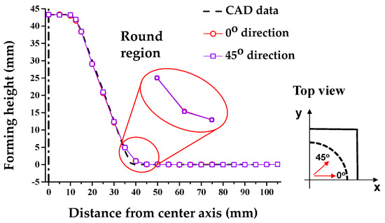Additionally, Figure 8 denotes the cross-sectional shape based on the 0° and 45° directions after the 1st SPIF process. Differences in round occur due to the asymmetric shape of the holder. Therefore, we compared 0° and 45°, where the difference for the round occurred the most. Due to the asymmetric geometry of the holder, a difference in R values occurred; R0 corresponded to 33.18 mm and R45 corresponded to 27.19 mm. Those correspond to the difference in shape error.