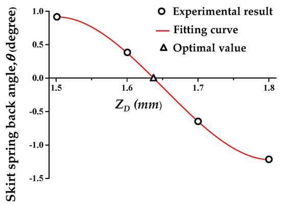 First, the ZD was optimized to compensate for the skirt spring-back. The spring-back due to the elastic recovery of the sheet is difficult to predict by simulation or theory. Therefore, it is efficient to optimize ZD by deriving the polynomial through several experiments. For this reason, the value of ZD was tested from 1.5 to 1.8 mm at 0.1 mm intervals.