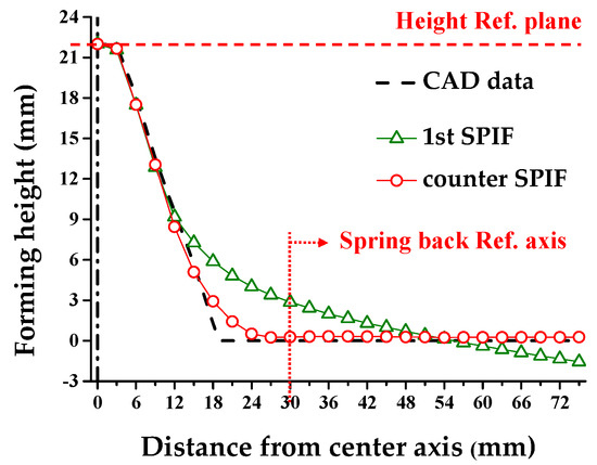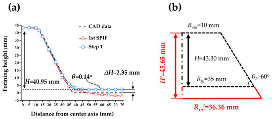 After that, the final forming height (H) was compensated. After the counter SPIF with the ZD of 1.63 mm, the height of the circular cup shape was reduced. To solve the problem, the tool path in the 1st SPIF should be modified. The initial tool path (Rin = 35 mm) resulted in H of 40.95 mm after the counter SPIF with the ZD of 1.63 mm. The height of the CAD data in the initial tool path was 43.30 mm. The difference between the CAD data and the experimental result was 2.35 mm. Therefore, it was necessary to newly form a circular cup shape having a final forming height (H) of 45.65 mm by adding the difference to the CAD data. Rin was compensated with a value of 36.36 mm. Figure 10b shows a schematic for compensating the final forming height.