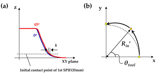 R was compensated in step 3. A clover-shaped tool path was used as opposed to a disk-shaped tool path to solve the problem. The clover-shaped tool path corresponds to a tool path modified by the difference (k) in the radius of the 0° direction (R0) and the 45° direction (R45) at the initial contact point in the 1st SPIF process, as shown in Figure 11a. The value of k was defined using Equation (2). The radius of the tool path was modified, as presented in Equation (3). Figure 11b shows the schematic figure of the modified tool path in the counter SPIF.