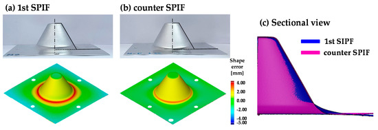 Figure 20 shows the shape error of the 1st SPIF and the counter SPIF processes using 3D-scanned data. Table 6 shows the δ and δm. When compared to the 1st SPIF process, δ decreased by 78.14% and the mean value of δm decreased by 40.28% in the counter SPIF. Thus, this demonstrated the reduction in the shape error of the counter SPIF process.