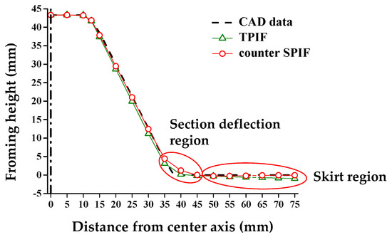 Two-point incremental forming (TPIF) is known as a conventional incremental forming process to reduce shape errors. In TPIF, the full die, which has the same geometry as the target shape, was employed. Figure 14 is a comparison of the cross-sectional shape between TPIF and the counter SPIF. In the section deflection region, TPIF was more effective than the counter SPIF. The reason was that the radius of the tool was 4 mm, so the range that could be pressed in section deflection region was limited. However, in the skirt region, the counter SPIF, which included the compensation of skirt spring-back, was more consistent with the target shape than TPIF.