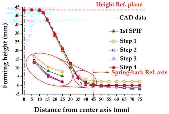 Figure 15 shows a comparison of the cross-sectional shapes from step 1 to step 4 to compensate for the shape error of the circular cup shape in the combined incremental forming process. Table 5 shows the results of the cross-sectional shape. A difference exists in H, θ, and R between the CAD data and the 1st SPIF.